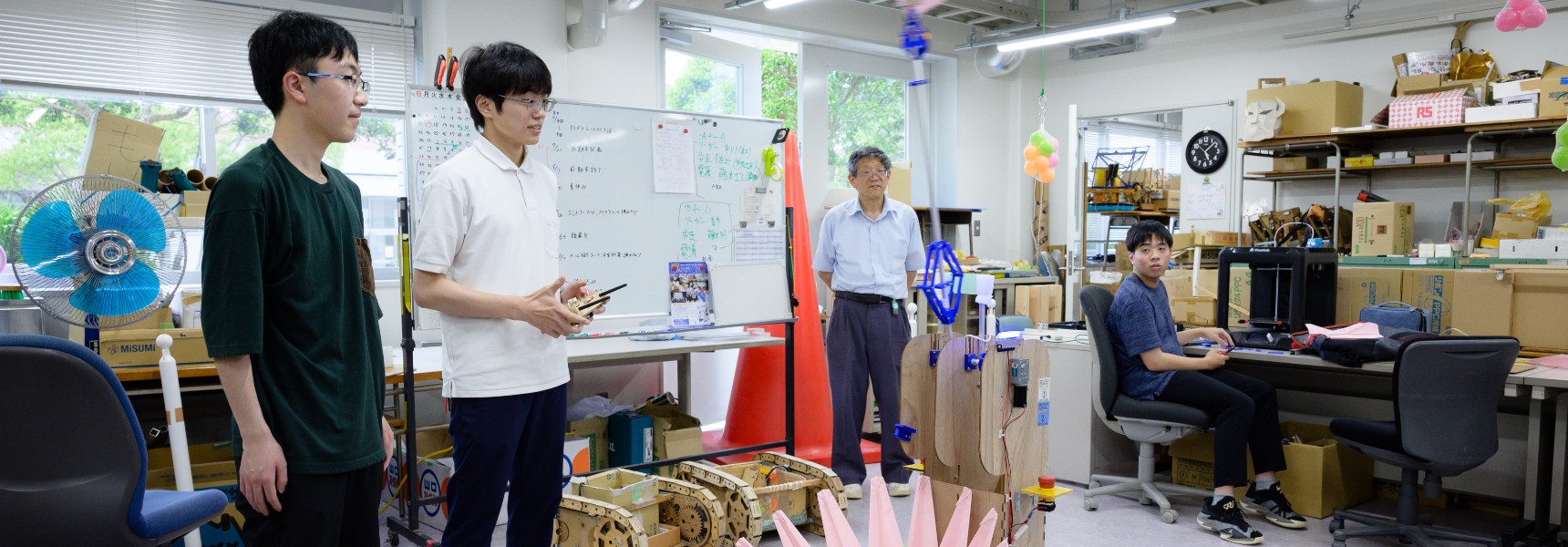 日ごろから木材を主とした再使用部品を使い、ロボットなどのものづくりができます。主な大会は高専ロボットコンテストと校内ロボットコンテストですが、令和元年度の福岡市科学館主催の国際宇宙ロボット(火星ローバー)コンテストでは1年生が優勝しました。ロボコン30年記念企画の動画制作ではニコニコ超会議賞を受賞しています。「大島商船高専・ロボコン30お祝いロボット」動画をご覧ください。