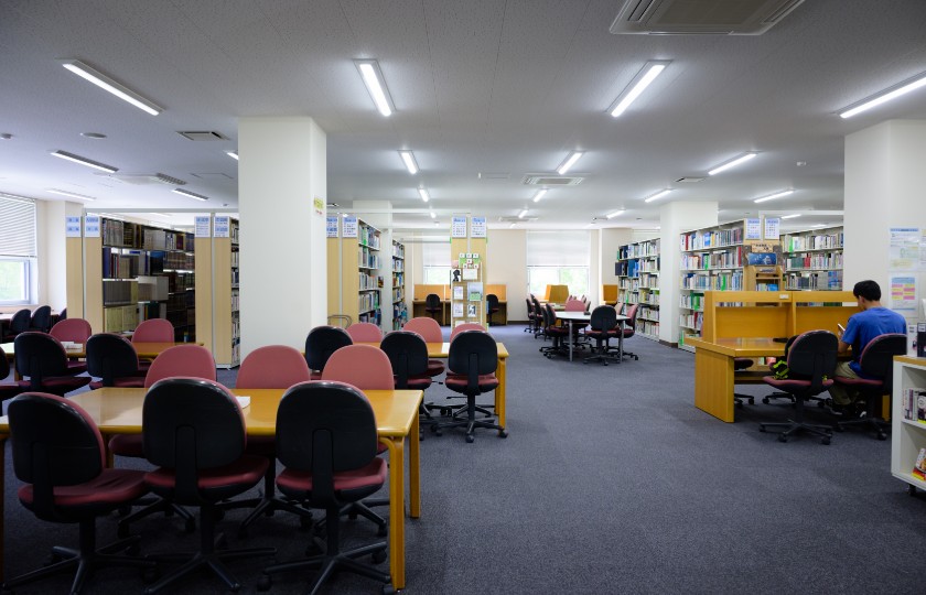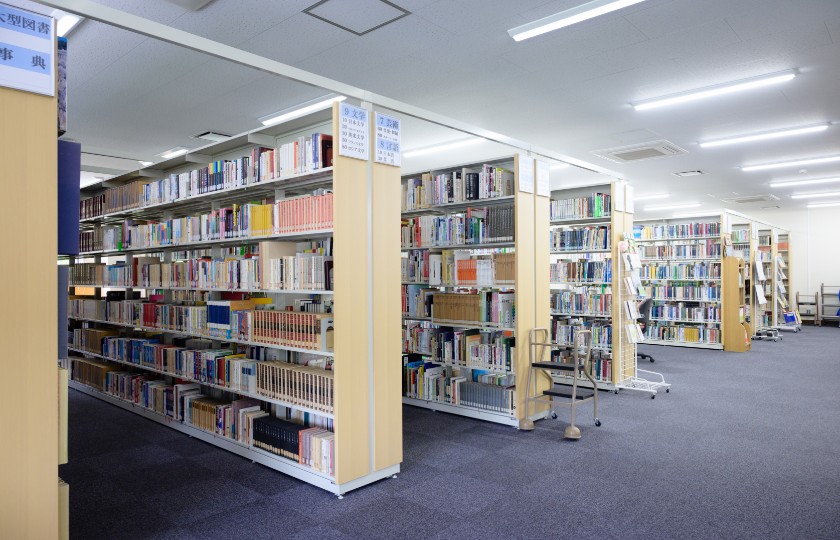 本校図書館には、約77,000点の図書などを備え付けており、一般教養から専門科目の学習、卒業研究や教員の研究活動のために自由に利用できるようになっています。通常配架に加え、各学科の推薦図書や「いのち」「防災」などの特別図書、雑誌やDVD、情報検索などのコーナーを設けています。