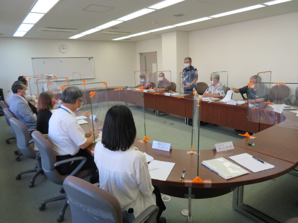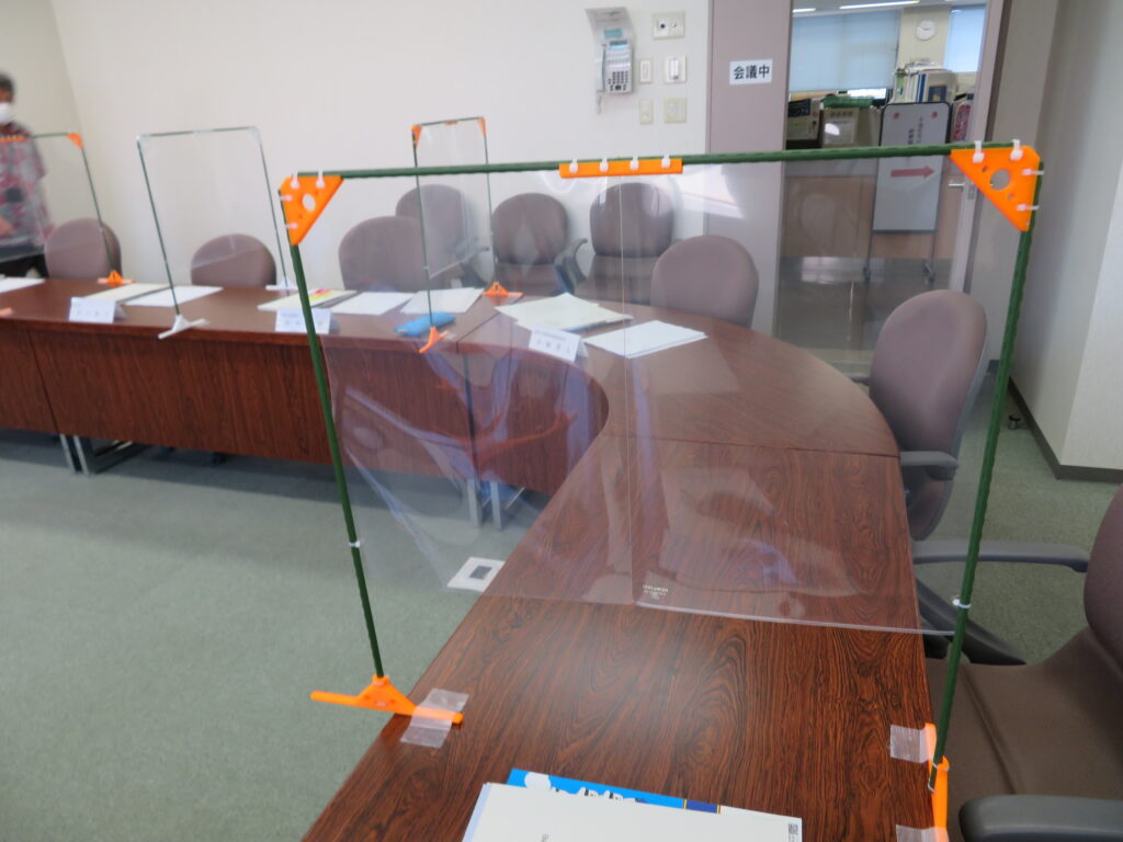 また、机上には本校が製作し、周防大島町に先日寄贈を行いました飛沫感染防止対策のパーティションが並ぶ中での会議となりました。