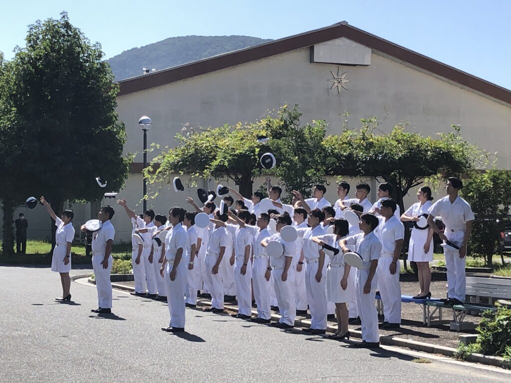 式終了後、卒業生は、出航時の儀式である登檣礼(とうしょうれい)にならって「ごきげんよう」と3回叫び、帽子を高く投げました。