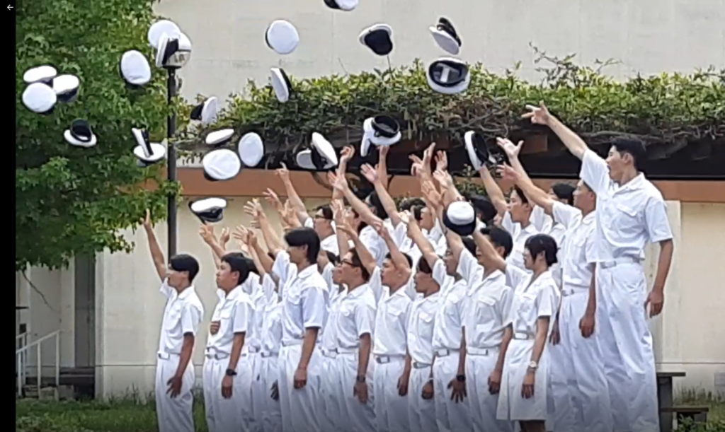 式終了後,卒業生は,帆船の出航時に行われる儀式である登檣礼(とうしょうれい)や登舷礼(とうげんれい)にならって「ごきげんよう」と3回叫び,帽子を高く投げ上げて,将来への活躍を誓いました。