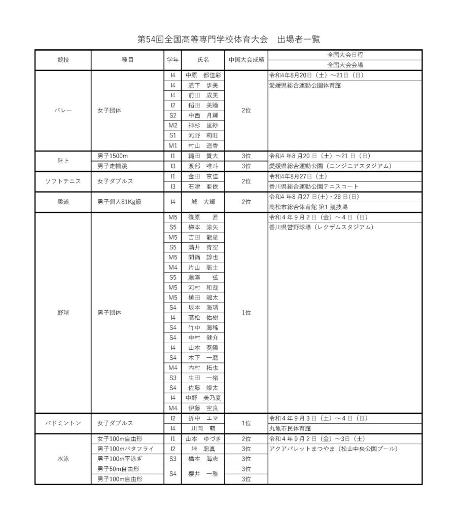 令和4年7月1日(金)から7月3日(日)に開催された第58回中国地区高等専門学校体育大会、令和4年7月18日(月)に開催された同大会水泳競技において、下記の通り、本校の学生の第54回全国高等専門学校体育大会出場者が決定しました。8月から9月に開催される全国大会での活躍が期待されます。