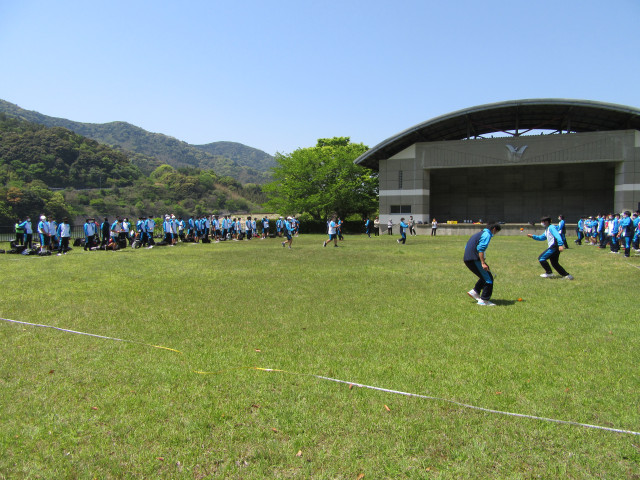 ハイキングは、大島商船高等専門学校から約5kmの距離にある、周防大島町屋代ダム公園を目的地に徒歩で出発し、公園では,学科の枠を超えた班編成による「お玉でみかんリレー」、クラス対抗の「八の字跳び」などのレクリエーションを行いました。晴天に恵まれる中、新入生同士、親睦を深めた1日となりました。