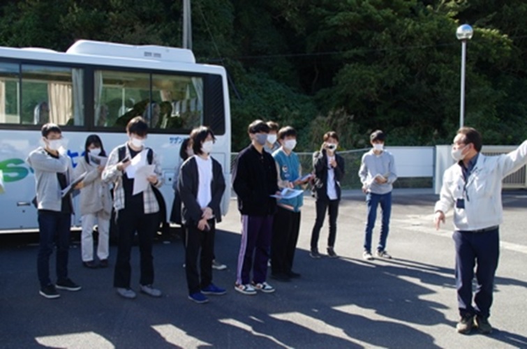 大島商船高等専門学校では、令和4年10月25日(火)に専攻科の創造工学演習「災害時の早期避難を促す仕組みづくり」の取り組みとして、周防大島町(屋代島)の災害地視察をバスにてめぐるフィールドワークを実施しました。