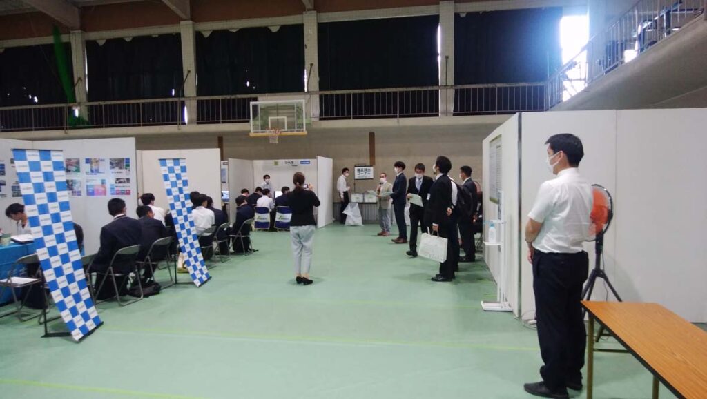 会場となった弓削商船高専(第一体育館)には、午前と午後合わせて約80社を超える出展があり、海運会社のみならず船舶管理会社や機械メーカーなど、商船高専卒業生の就職先として採用実績のある会社が多数来場しており、学生も各社ブースにて真剣に耳を傾ける等、有意義に時間を過ごすことができました。