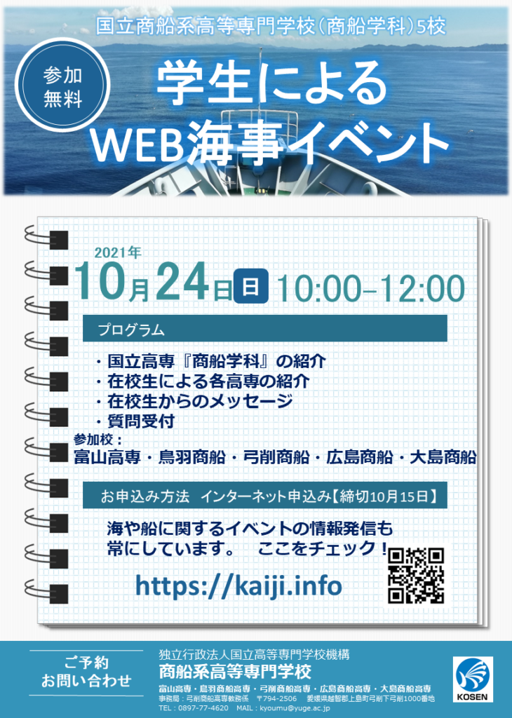 次世代の海洋人材育成プロジェクトに係り、5商船系高専における学生主体のWEBによる海事の啓蒙イベントを実施いたします。
