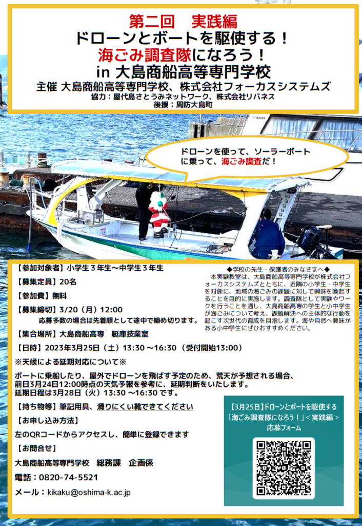 令和5年3月25日(土)に公開講座「ドローンとボートを駆使する「海ごみ調査隊になろう!」(第2回 実践編)」を開催します。