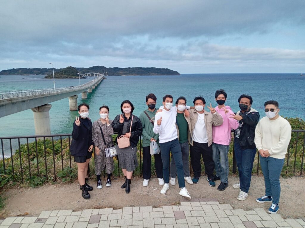 2022年11月13日、本校留学生および日本人チューター学生の10名と国際交流室の教員2名で、角島、元乃隅神社、秋芳洞へ研修旅行に行きました。この旅行は、日本の文化や景色を体験し日本事情を理解してもらうとともに、留学生と日本人学生の親睦を深めることを目的として実施しています。例年、1泊2日の行程で実施しておりましたが、昨年、一昨年前と新型コロナウイルス感染症の広がりのため中止しておりました。今年度は、日帰りではありますが、3年ぶりに実施することができ、学生は全員初参加になります。今回の研修旅行では同じ県内でも普段は行くことのない場所に行くことができ、参加者は見聞を広げることができました。