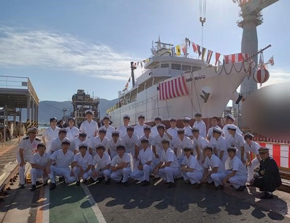 進水式直前の新大島丸をバックに5年生全員