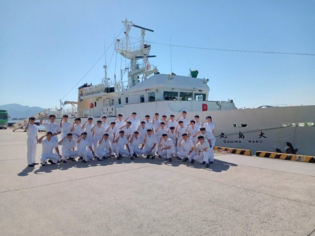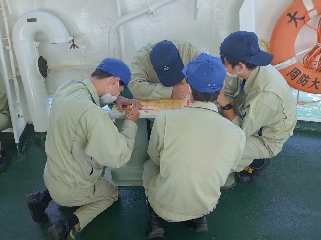 現大島丸に感謝の意を込めて、最後の整備作業を行うデッキコース学生
