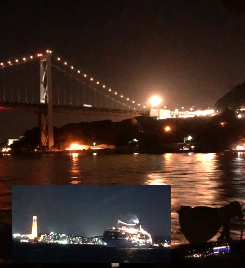 夜間航行訓練での関門橋と下関沖で航過した飛鳥Ⅱ