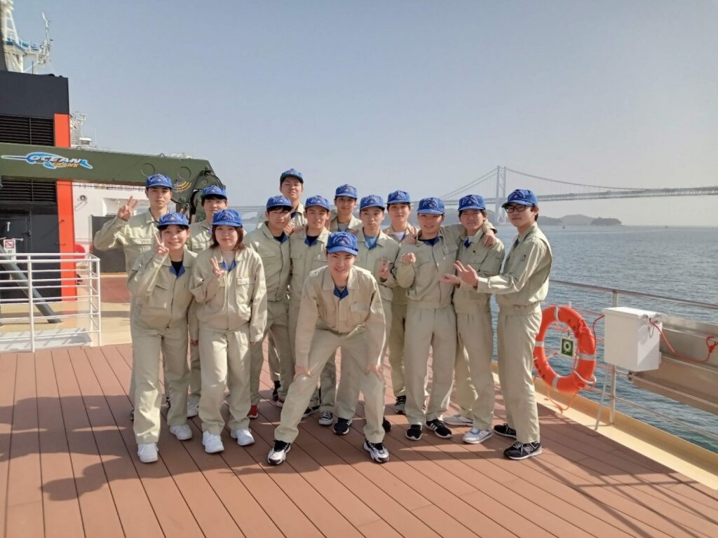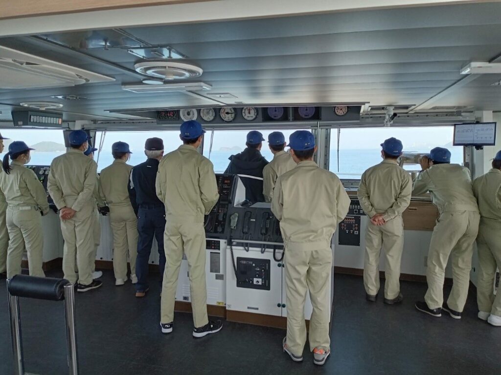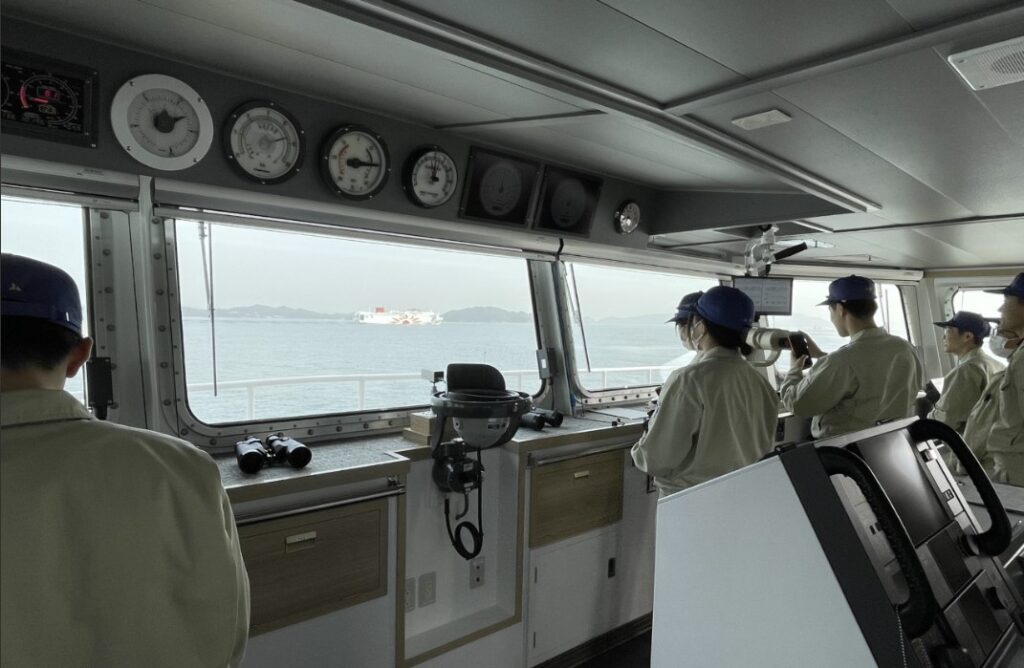 2023年4月12日から4月14日にかけて、商船学科5年生が丸亀港・高松港への航海実習を行いました。新大島丸が就航して、初めての航海実習です。新装なった設備に加え、2倍以上に拡大された船橋や機関制御室では余裕を持って実習が行えるため、学生から感嘆の声があがっていました。電気推進船のメリットを十分に活かした静粛性の高い船内では、実習密度を高め腕に磨きをかけていました。