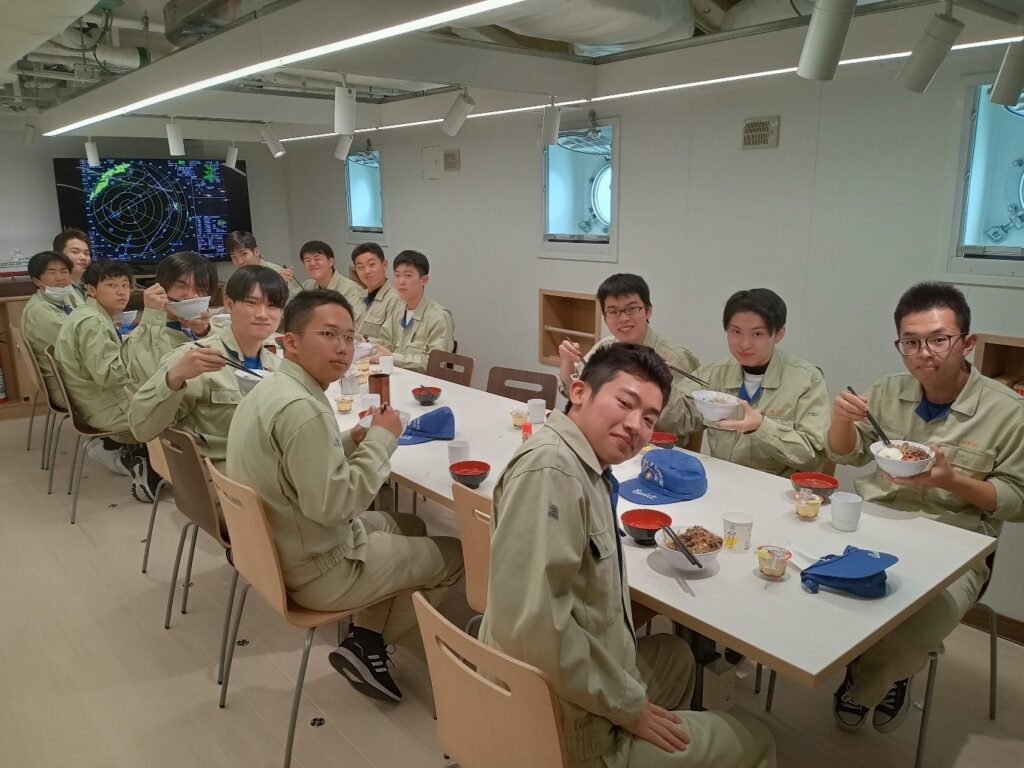 対面との幅がとれる長テーブルで牛丼の昼食 航海コース学生