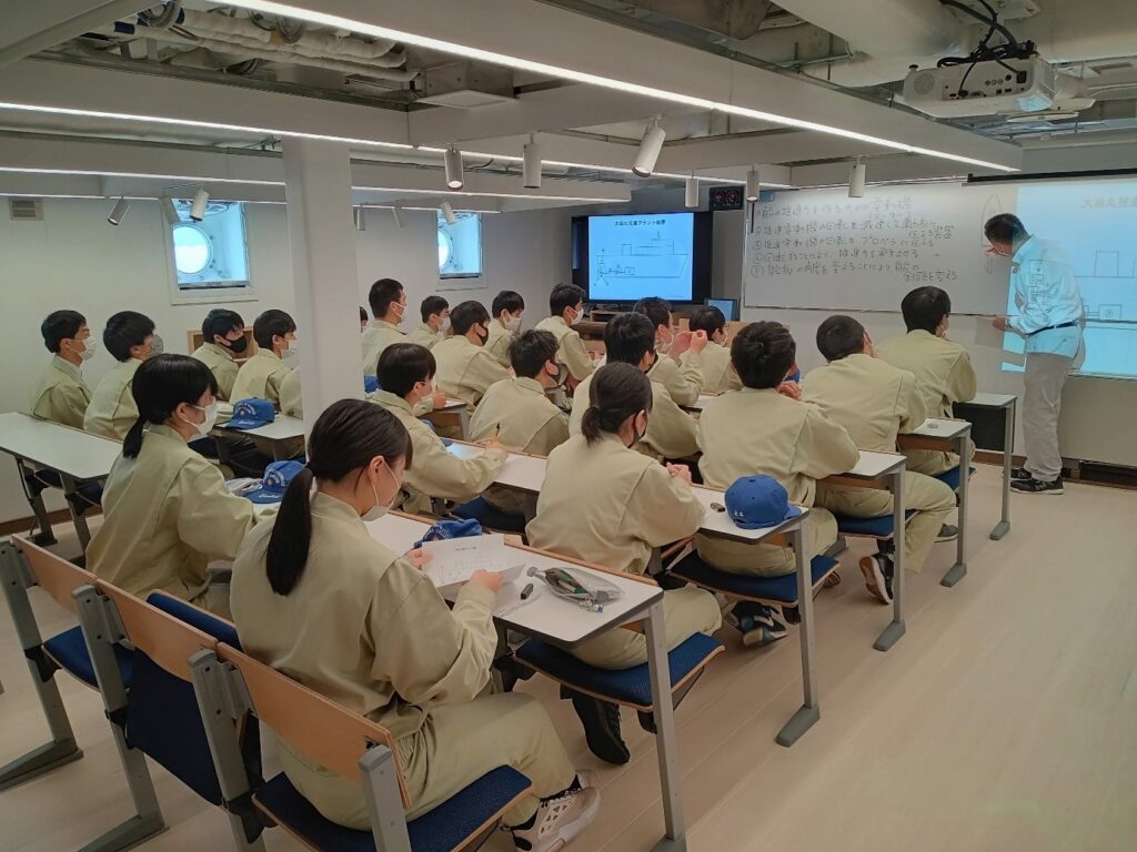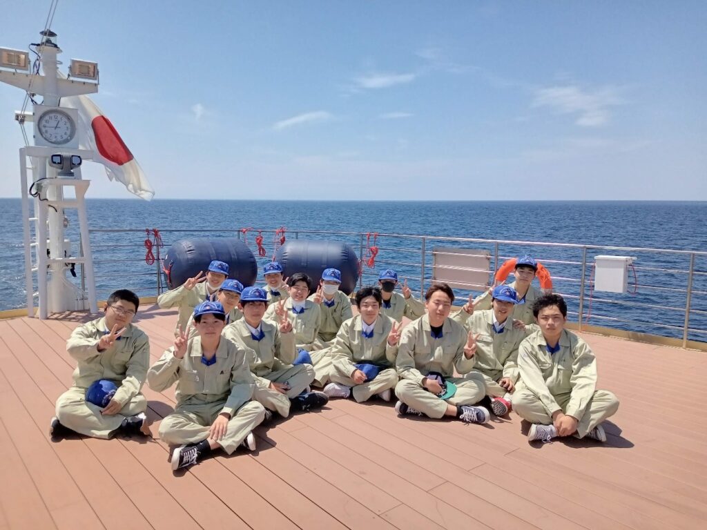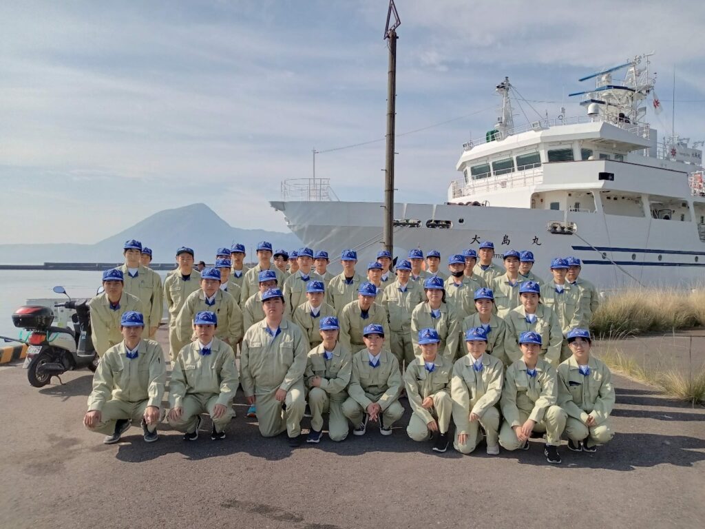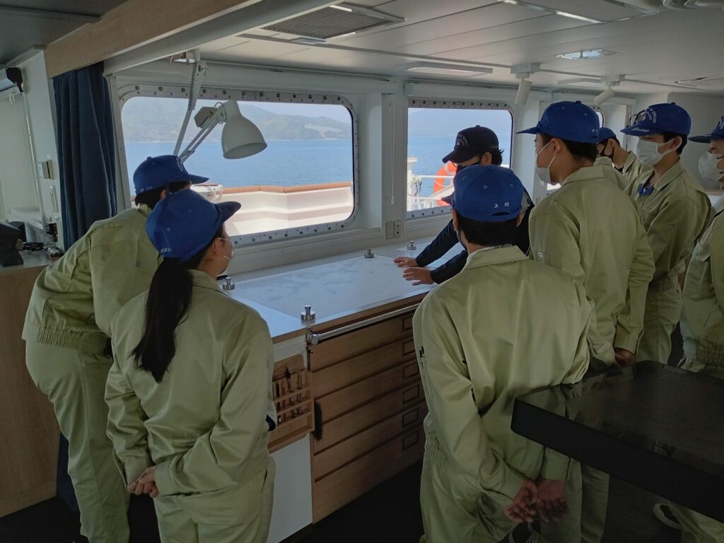 2023年4月27日から4月28日までの2日間、商船学科1年生の航海実習を行いました。はじめての航海実習となるため大変緊張した面持ちでしたが、新しい練習船の設備に驚きながらも船内生活を満喫していました。 目的地の別府港では大島丸と同時期に同じ造船所(三菱造船株式会社)で建造された「さんふらわあくれない」の外部を見学をしました。将来船員になった自分の姿を想像できた様子でした。