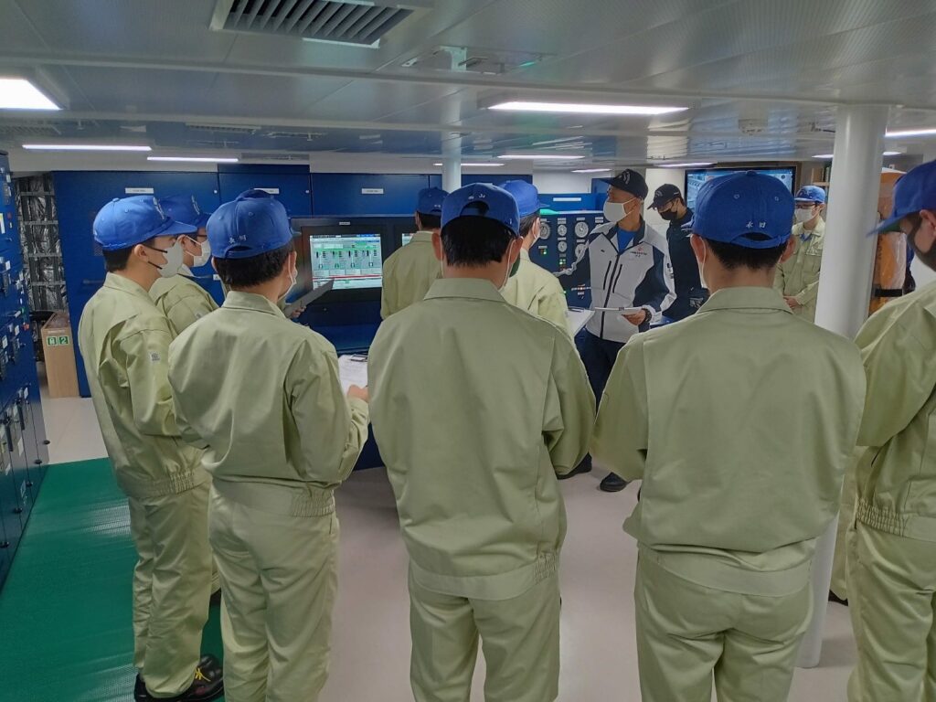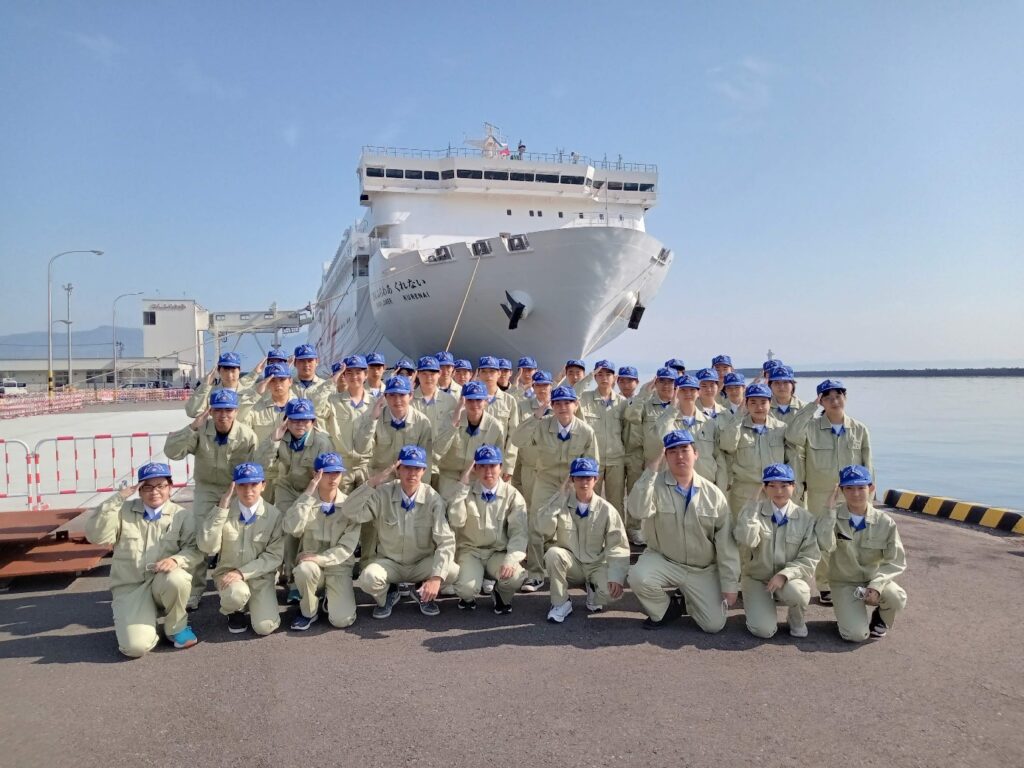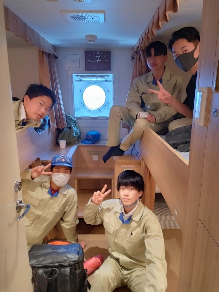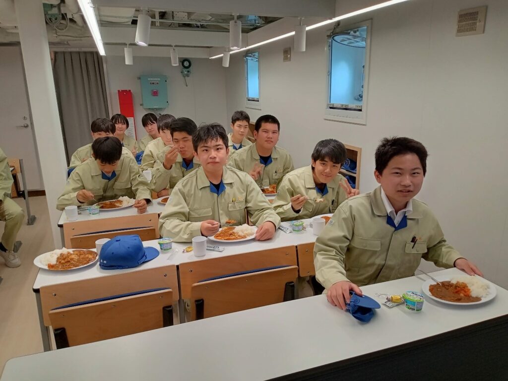 2023年4月27日から4月28日までの2日間、商船学科1年生の航海実習を行いました。はじめての航海実習となるため大変緊張した面持ちでしたが、新しい練習船の設備に驚きながらも船内生活を満喫していました。 目的地の別府港では大島丸と同時期に同じ造船所(三菱造船株式会社)で建造された「さんふらわあくれない」の外部を見学をしました。将来船員になった自分の姿を想像できた様子でした。