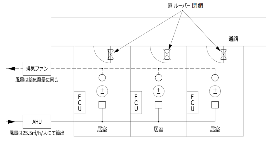 代船では、各部屋に吸気される風量と同じ量を排気できる機械を個別に設けて、他の部屋の空気と混ざることなく、部屋毎で吸排気が完結する方法を取っている。