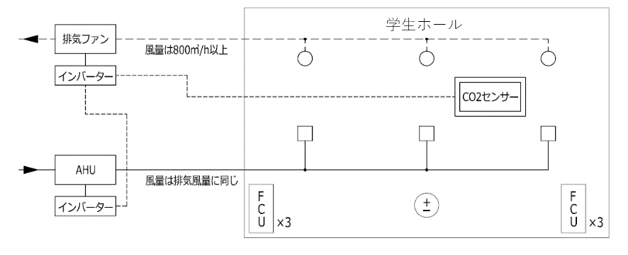 特に多くの人が集まる学生ホールは、中にいる人の数によって換気回数を自動的に調整できるようになっている。