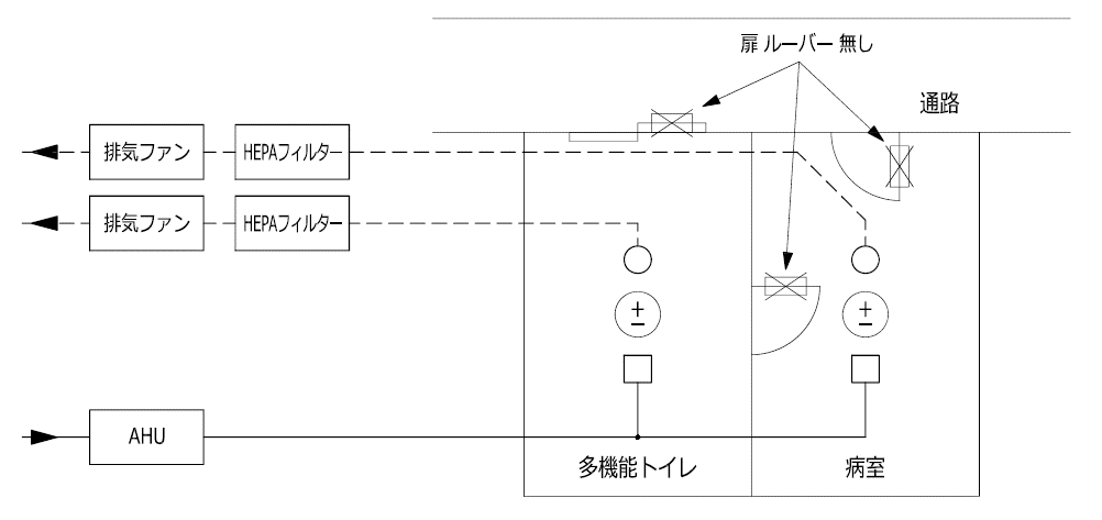 基本的に船内で罹患者が発生した場合は、速やかに陸上の病院に送り出すことになっているけど、隔離しておく間の病室には特別な措置をとっている。病室と隣接する多機能トイレの換気システムは他と分離されていることに加えて、排気ファンには特殊フィルターを付けることにより、ウイルスが外に漏れ出さないようにしている。