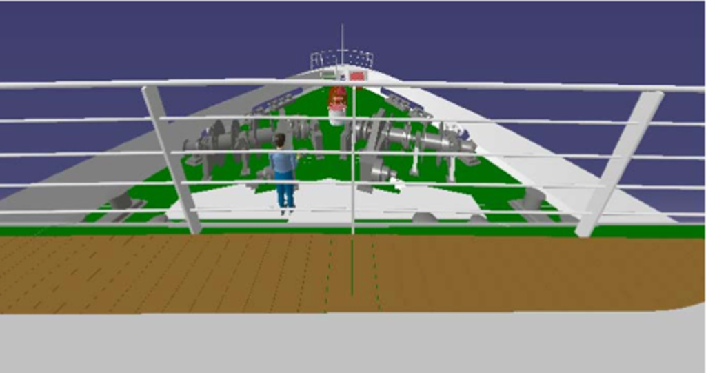 計画段階で、ブリッジ前に通路が欲しいと他の商船高専から要望があったので、それを採り入れることになったのだが、この下が階段になっているため有効な幅が必要なこともあって、ブリッジから船首作業が見えにくい構造となってしまっていた。