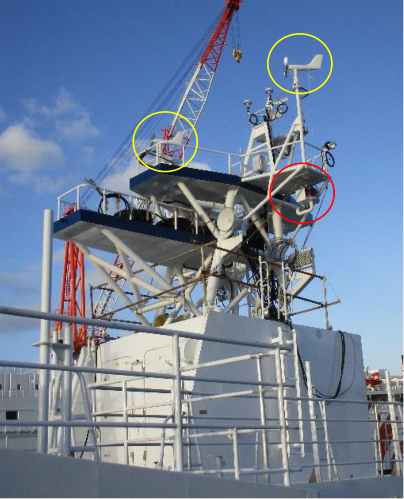 マストの両側に風向風速計が備えられていて、本格的だろう。(黄色枠)