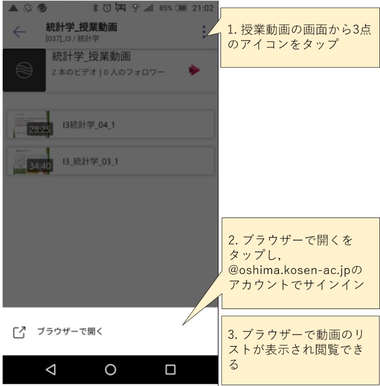 - ブラウザーで開くをタップして、@oshima.kosen-ac.jpのアカウントでサインインする。