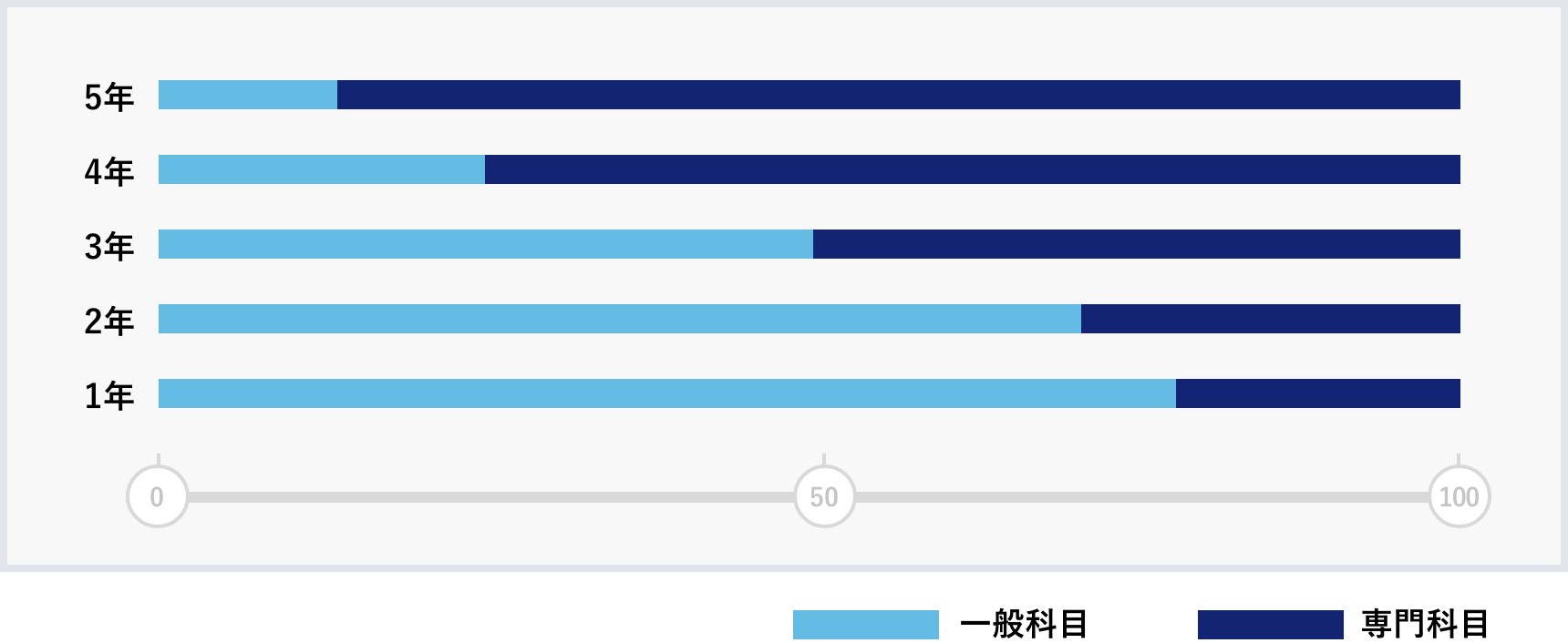 高専では5年間一貫教育の特長を生かして、専門科目とともに、しっかりした素養を与える一般科目も学びます。低学年では一般科目を多くし、高学年では専門科目を多くした、バランスよく配置されたユニークな教育が行われています。