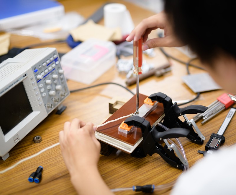 電気・電子・機械・情報工学の基礎から、専門科目を幅広く取り扱っており、実験や実習形式の授業も多く準備されています。幅広い分野の素養を身につけることで、複合的な視点で取り組める技術者の養成を目指しています。